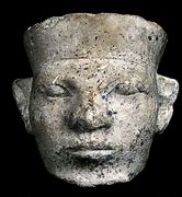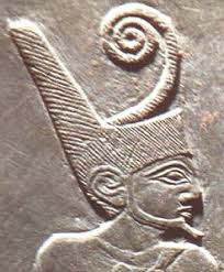 Closeup of face of Narmer from other side of palette wearing the crown of Lower Egypt