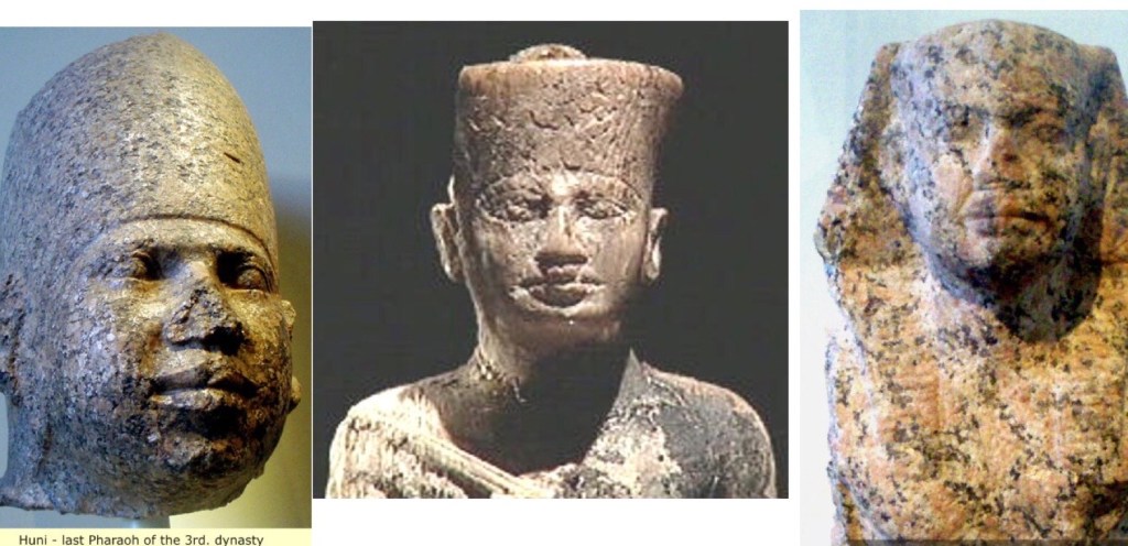 Old Kingdom Pharaohs(L to R): Hani-3rd Dynasty; Khufu-3rd Dynasty; Niuserre-5th Dynasty